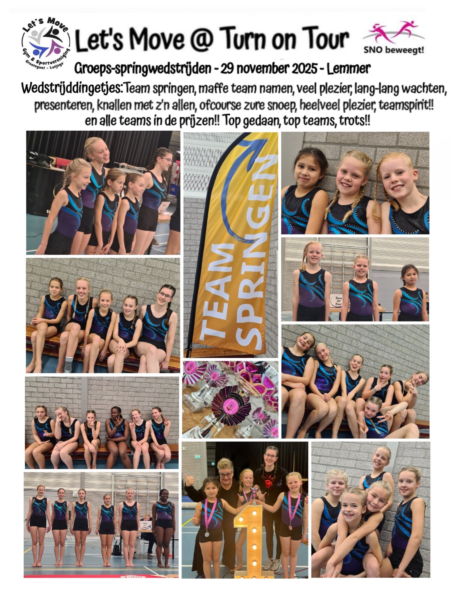 Afgelopen weekend stond voor maar liefst 25 turnsters van onze woensdag- en zaterdagselectie volledig in het teken van springplezier, teamspirit en knallen op de wedstrijdvloer. Met vijf teams reisden we vroeg in de ochtend af naar Lemmer voor de eerste springwedstrijd van het seizoen Turn on Tour.